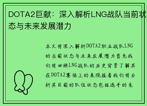 本文将深入探讨TES战队在DOTA2赛事中的表现与实力分析。首先,我们会从战队的历史背景及发展历程入手,了解TES是如何在竞争激烈的市场中脱颖而出的。接着,分析战队现有阵容中各个选手的个人能力,以及他...