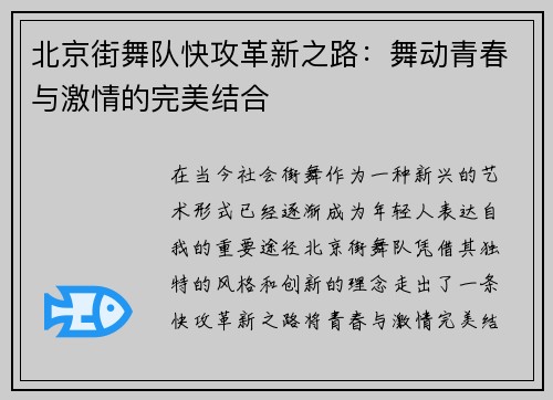 本文围绕“北京极限运动队的灵活性研究与发展趋势分析”这一主题展开,旨在深入探讨北京地区极限运动队伍在灵活性方面的表现及其未来发展趋势。首先,从灵活性的定义入手,阐明其在极限运动中的重要性,并结合当前的...
